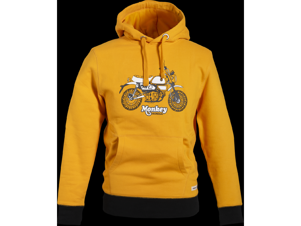 Na hrudi potisk s logem opice a na kapuci logo Honda. Kontrastní černé manžety.